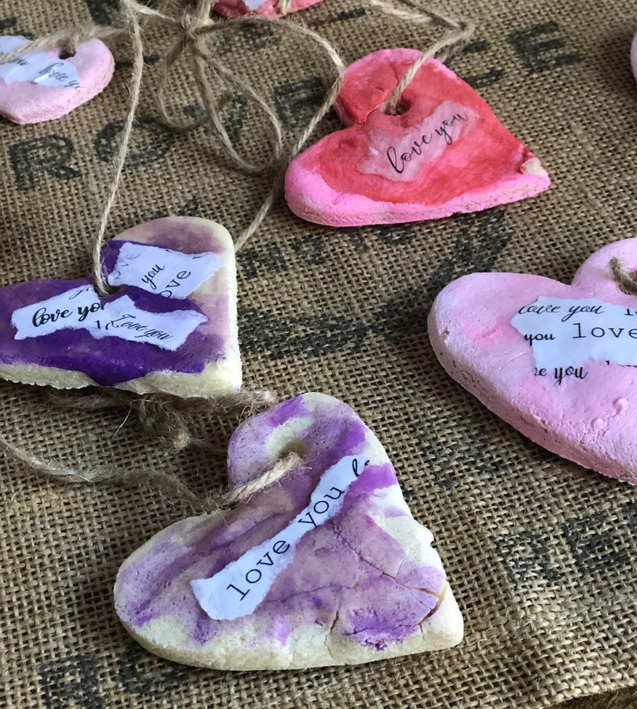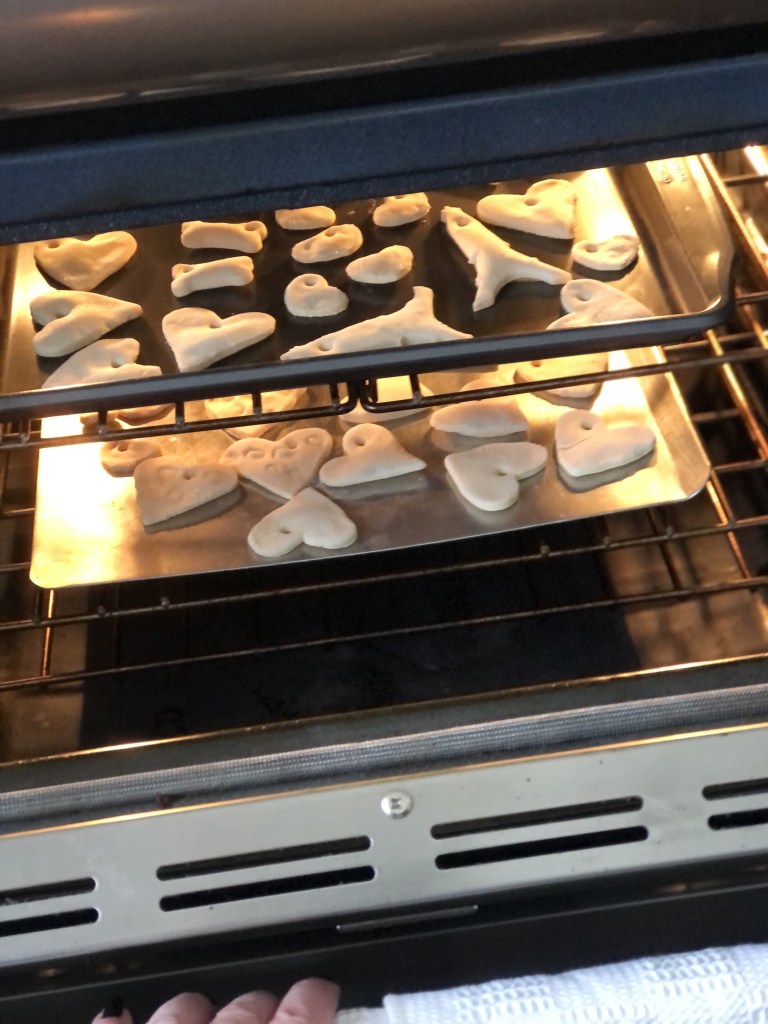 If you are just making hearts you can just bake them. If you want to make them hang on a string, you will have to now poke a hole into each heart, so that way you can tie them with twine. I used a hard straw, which I do not recommend, as I had a heck of a time getting the dough out after. (I always learn the hard way first)