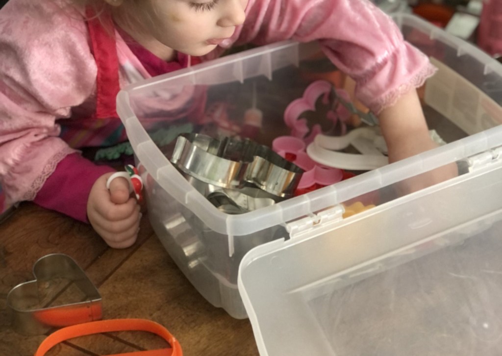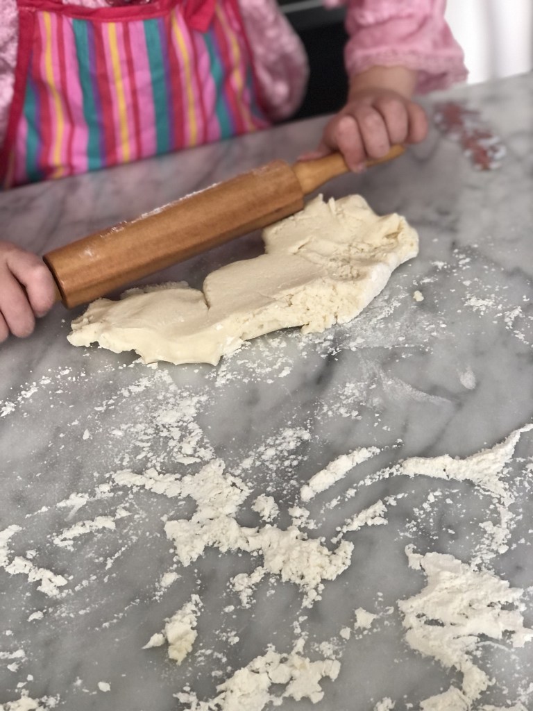 Tip: While I made the dough, I gave my granddaughter a box of cookie cutters and asked her to find the heart ones. This kept her busy, and gave me time to prepare dough.