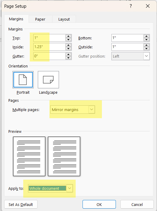 The last thing I have set up is for margins. Here is the dialog box for that. Again, please do not miss the whole document box.
