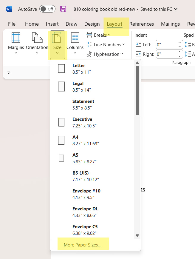 If you want to simply press on, please open your word document and set up the page size. The image below shows where to go. When you setup your word file, you have to set margins up for bleed. Bleed is the how the image goes to the edge of page so when book is trimmed there is no white or missing images. Later you will see the bleed when you do a preview in kdp when proofing your book. But that is much later, lets return to setup! Follow the image below and set up your book. Most of the time it is picking a size and adding .125 to the page.