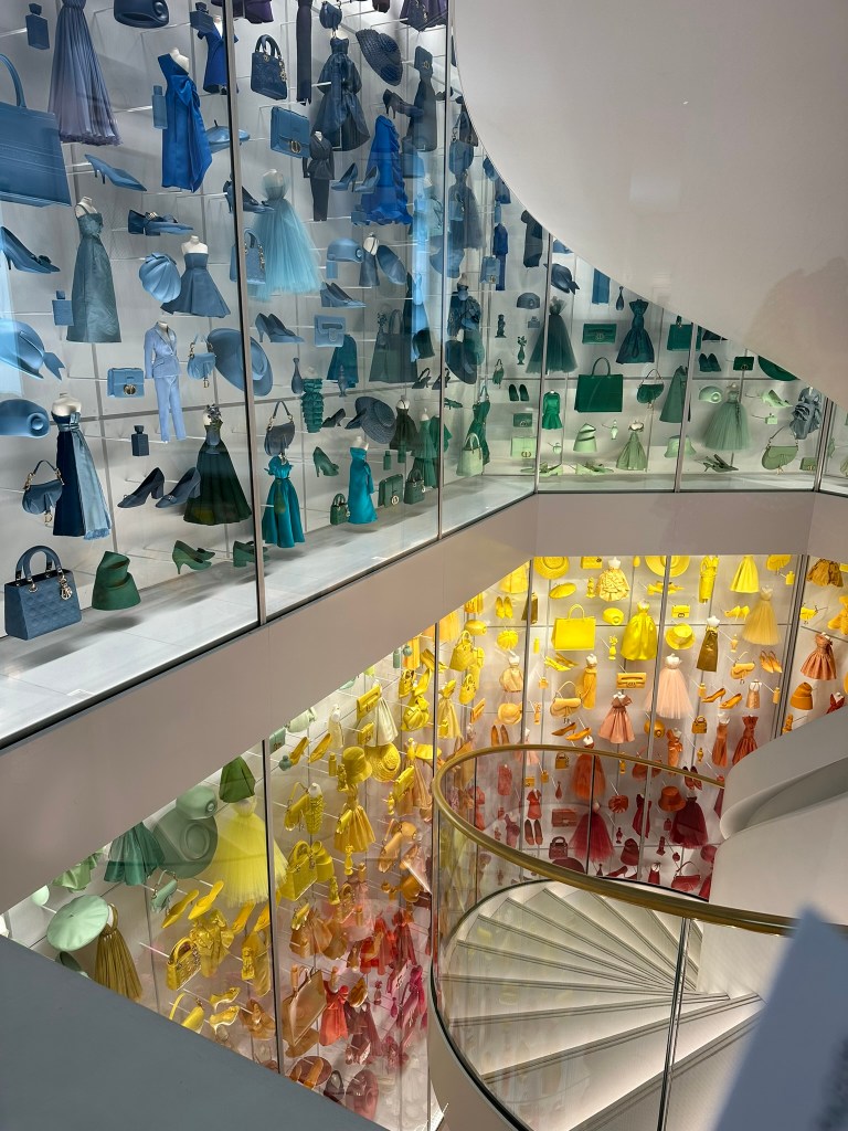 We also visited the Christian Dior Museum, and the dress displays were incredibly creative. If you enjoy fashion this museum is worth the trip. Dior loved the woman figure and wanted to make a woman feel wonderful… and beautiful. The displays show his beginnings and the work he did to become an icon. And the rainbow-colored staircase with fashion accessories and small dresses is a sight to behold!